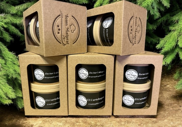 En tur i skogen: Skogsoppkrydder uten salt. Skogssopp (kantarell, traktkantarell, piggsopp og steinsopp), mjødurt, rosmarin, einebær, timian, salvie, sort pepper og Ingefær. Passer veldig godt til viltkjøtt, viltsauser og soppstuing