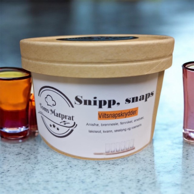 - 1 boks viltsnaps-krydder (anisfrø, brennesle, fennikel, enebær, lakrisrot, kvann, røsslyng og rosmarin)